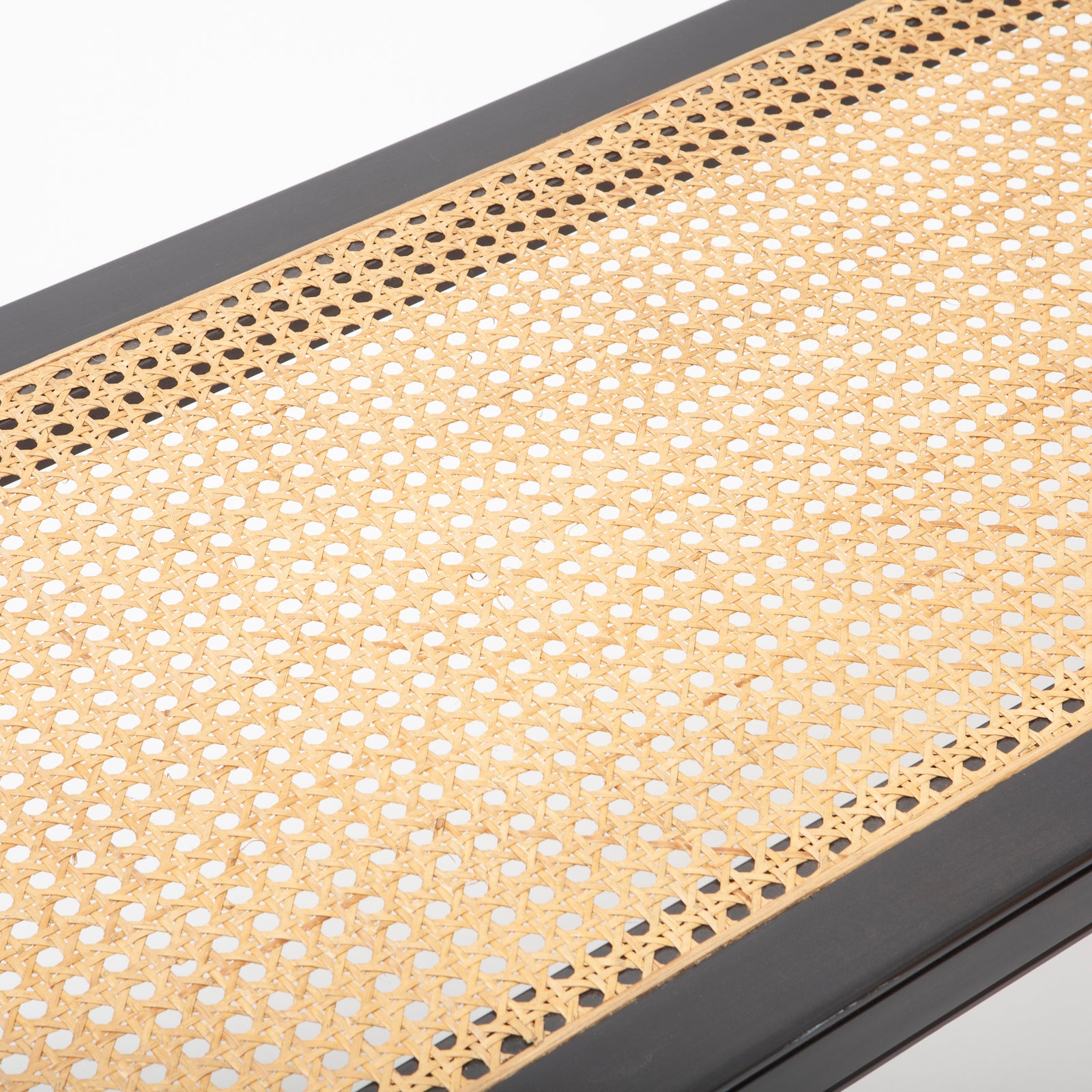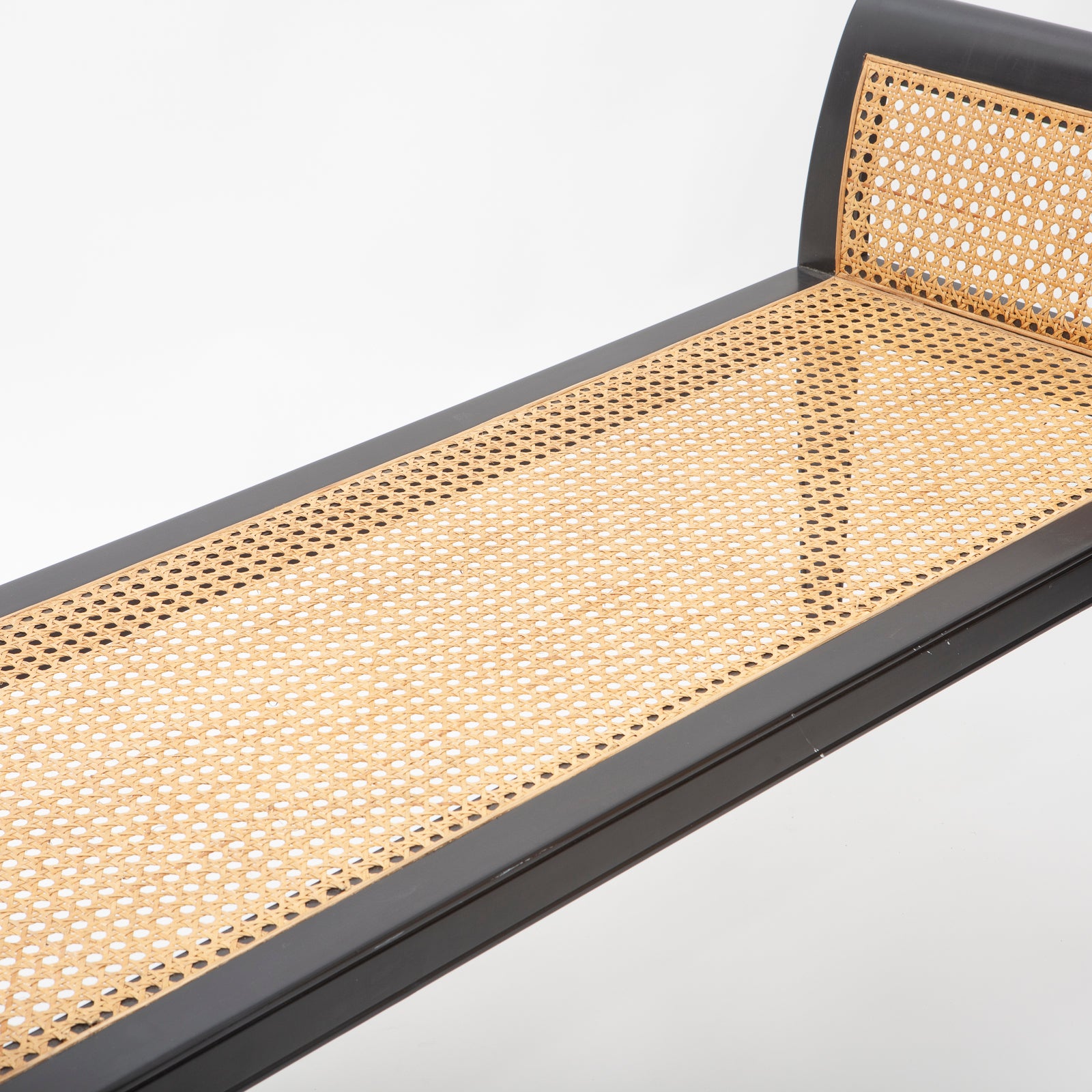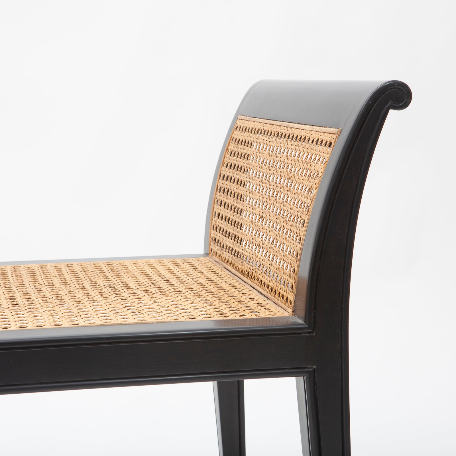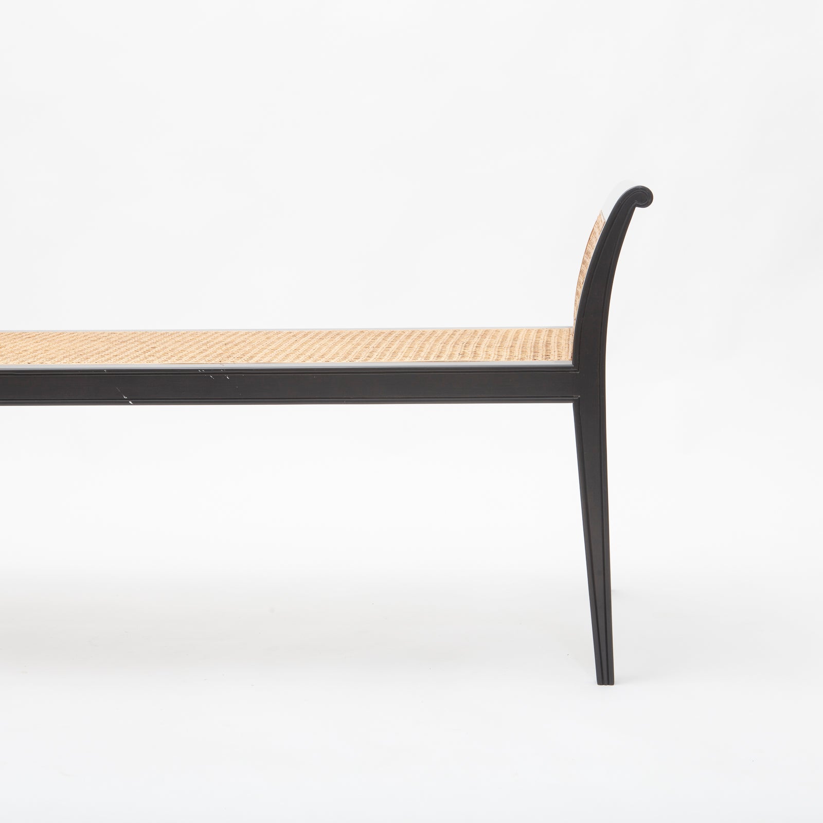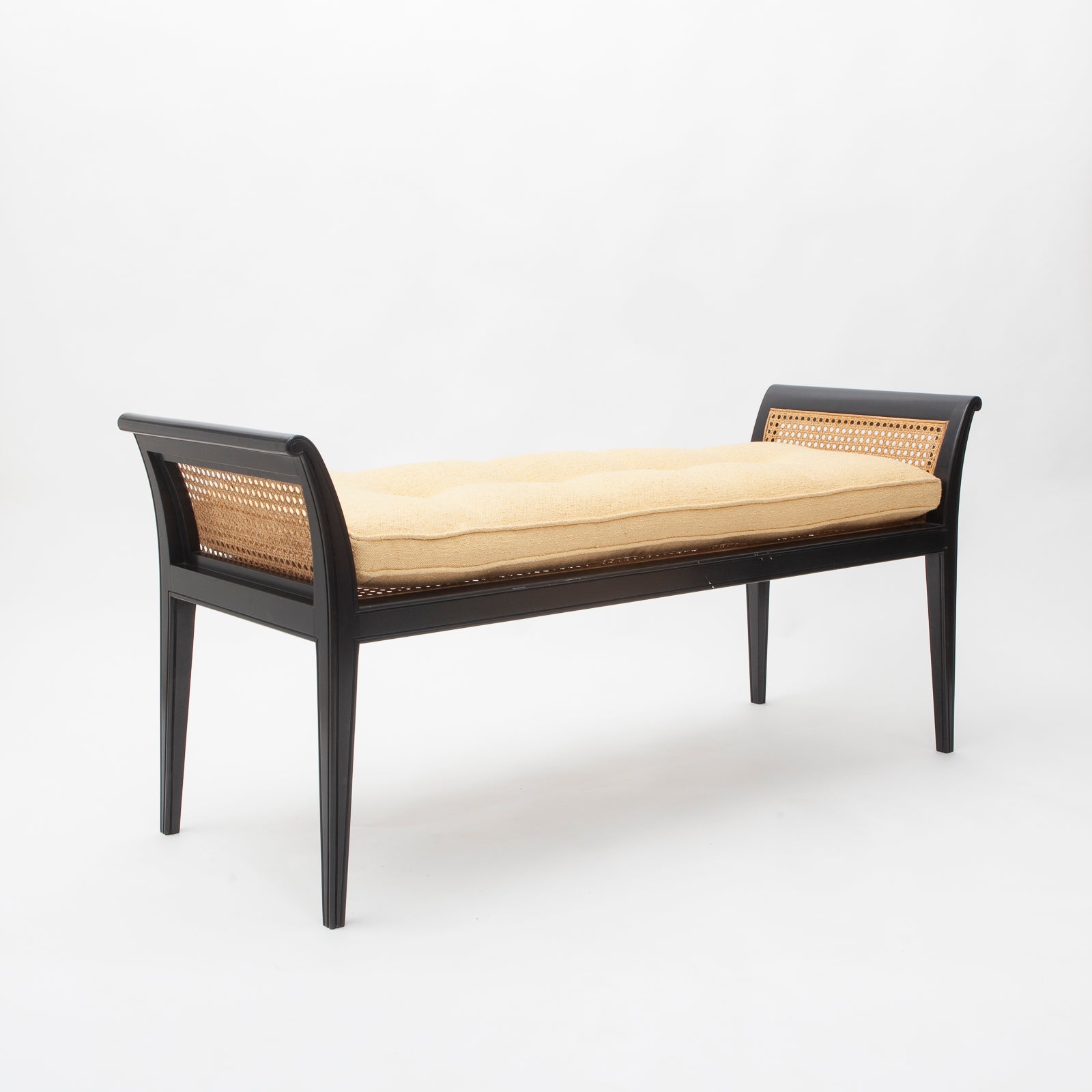 Extra long rolled arm bench with lacquer wood finish and cane bench with tufted cushion topper. In the manner of Edward Wormley for Dunbar.