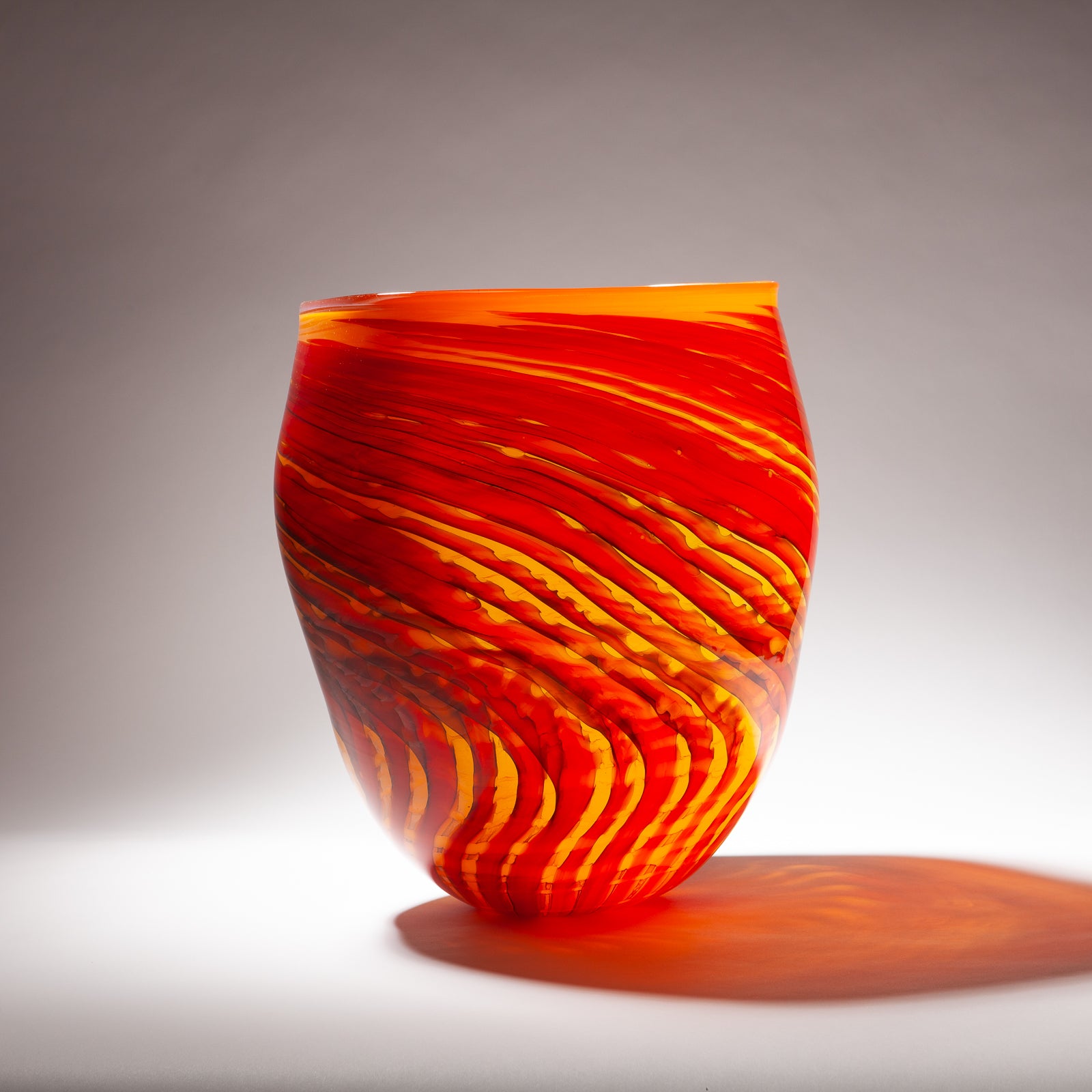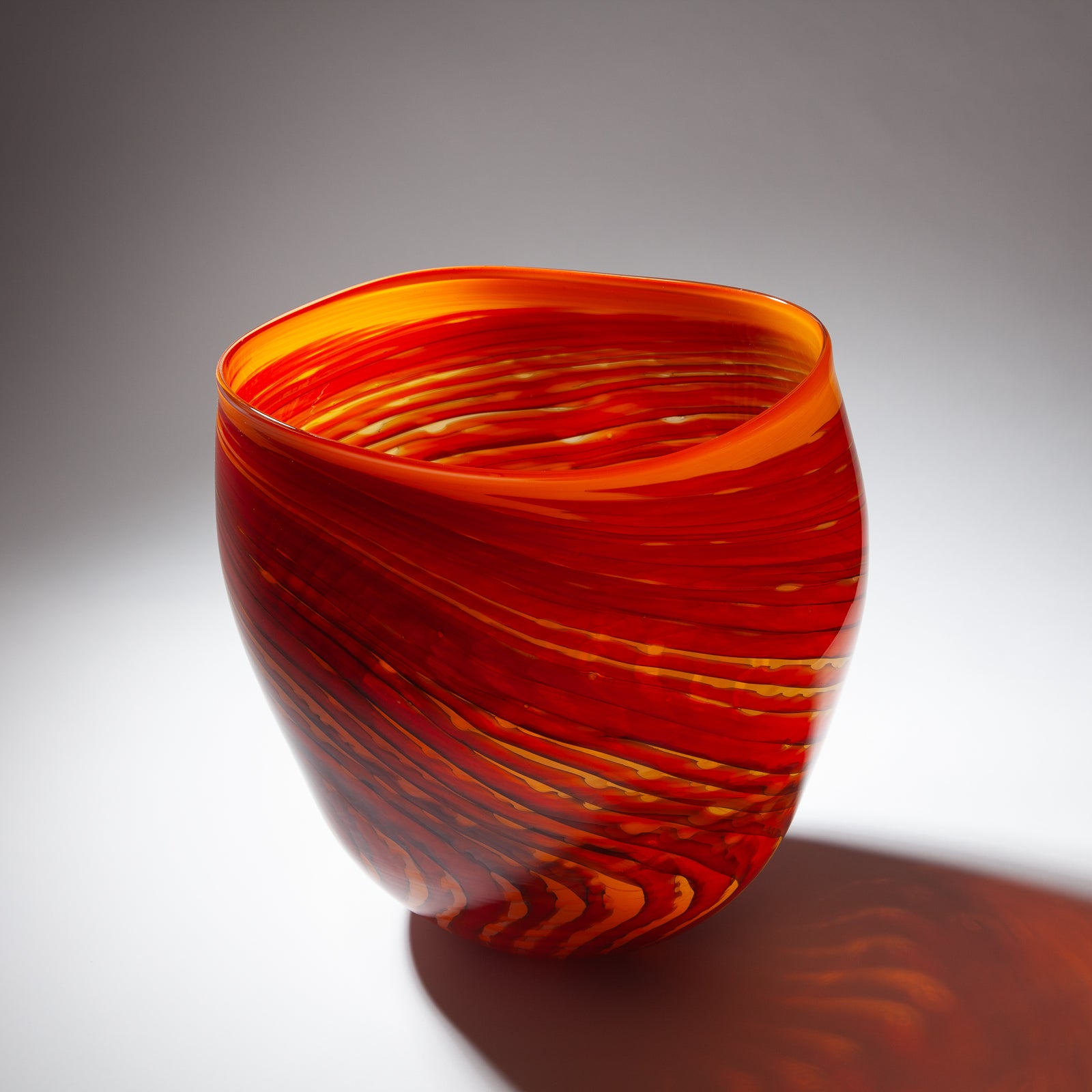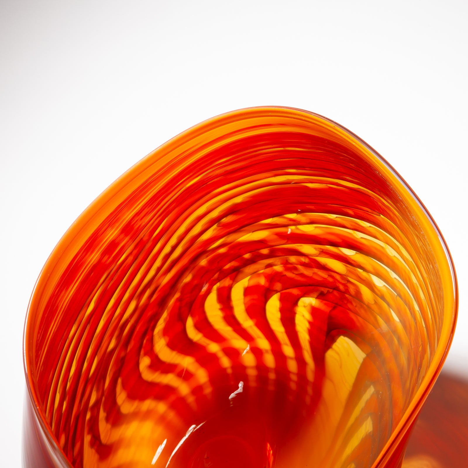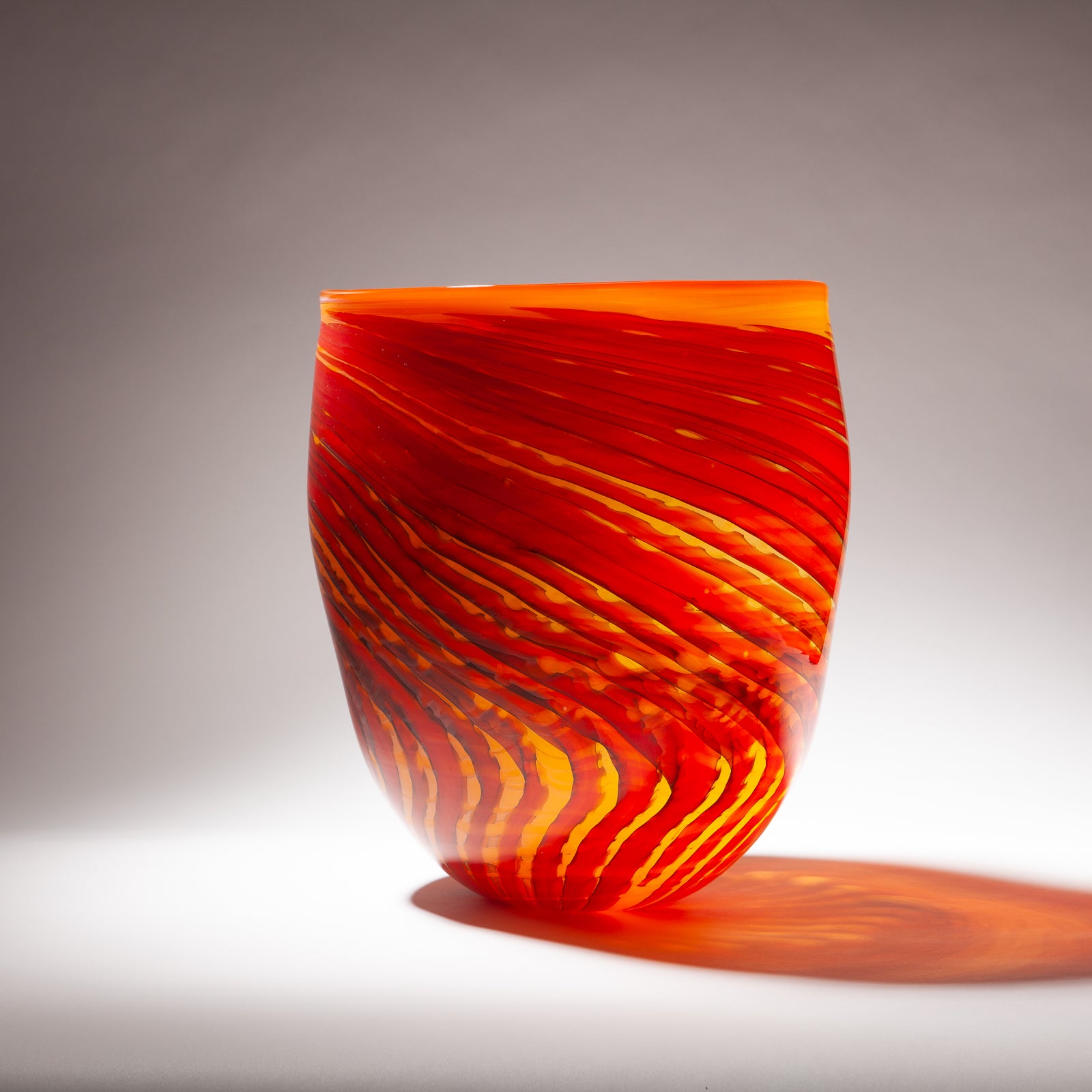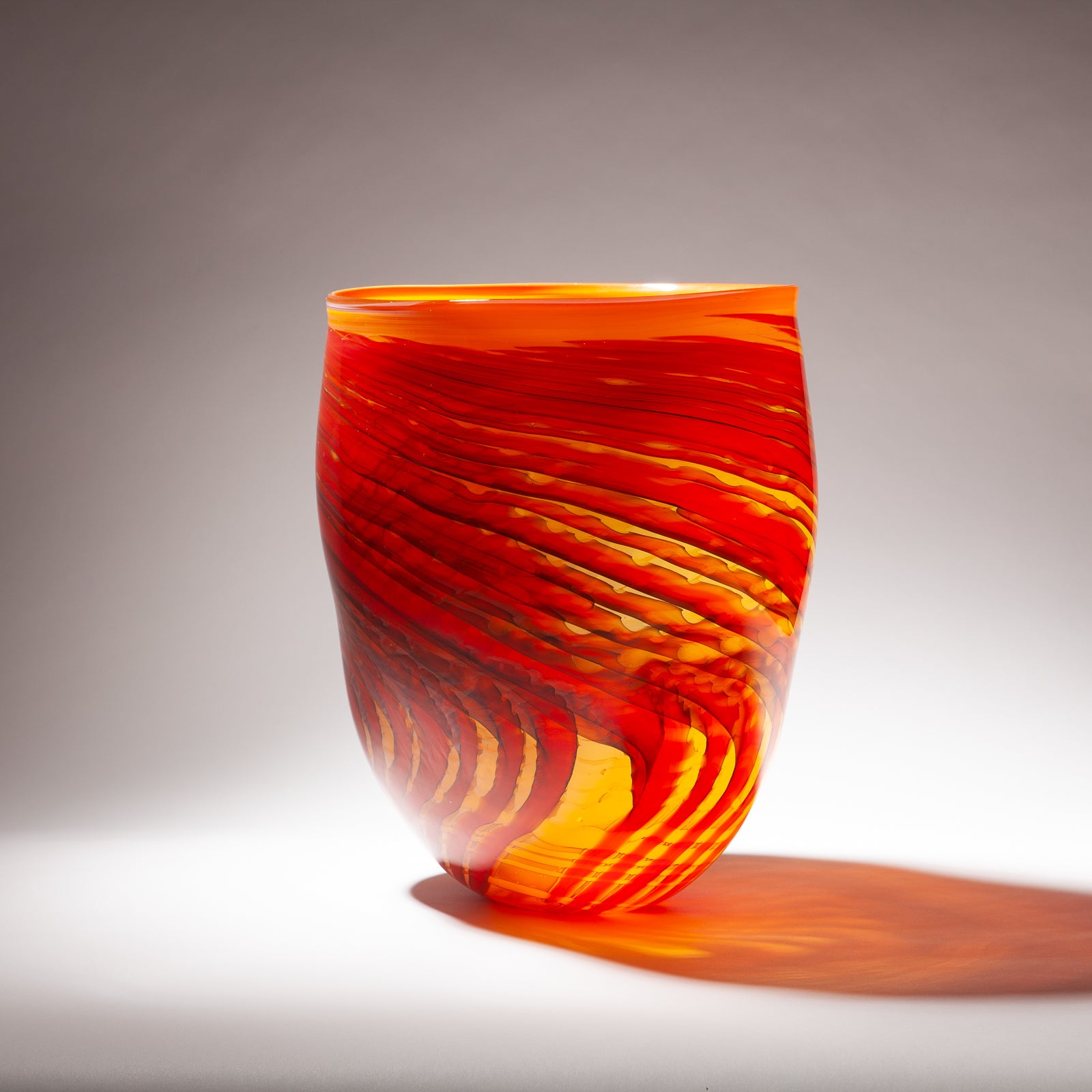Impressive large orange blown glass vessel with swirl pattern.