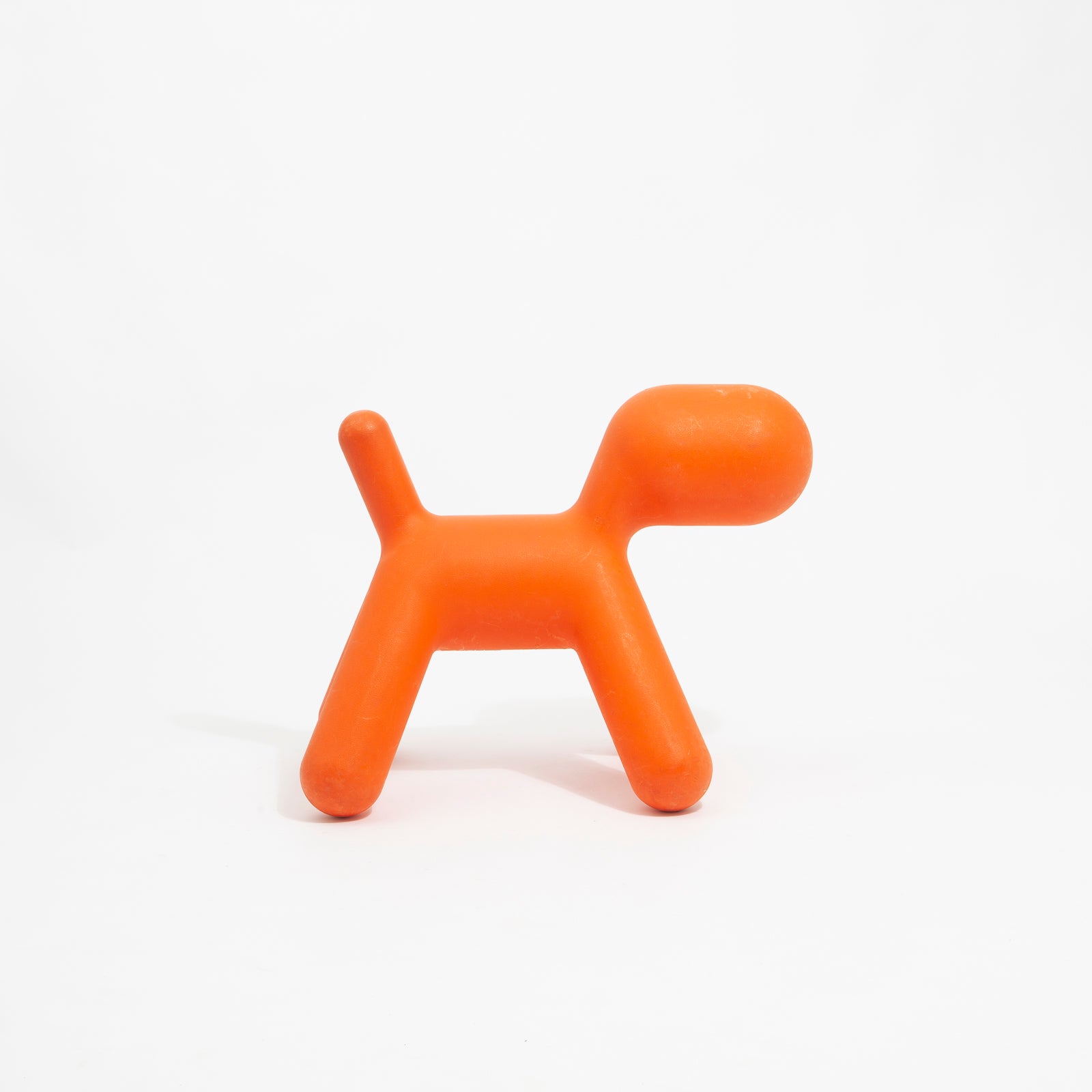 Made for children, this large vibrant orange polyurethane dog is suitable for indoor or outdoor play.
