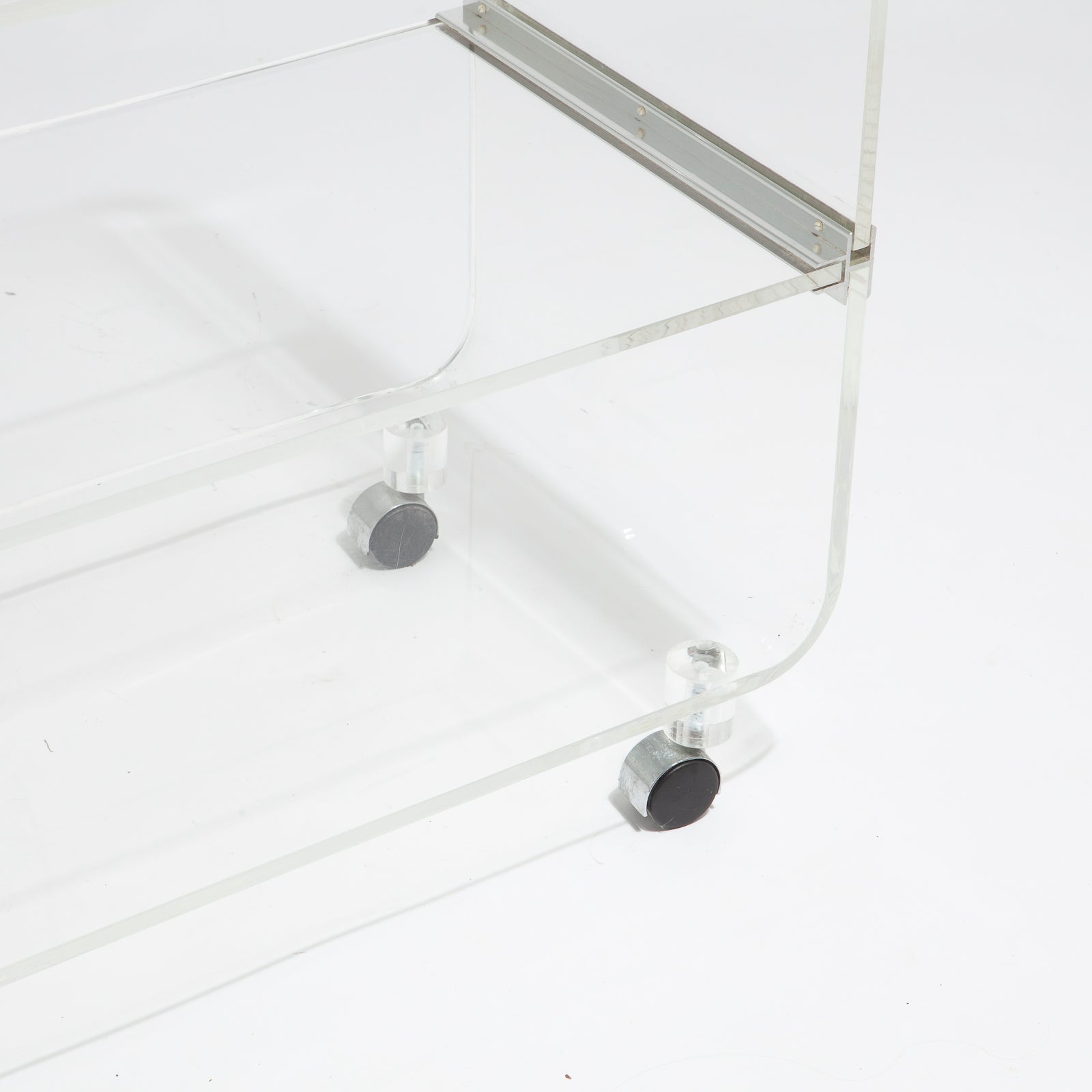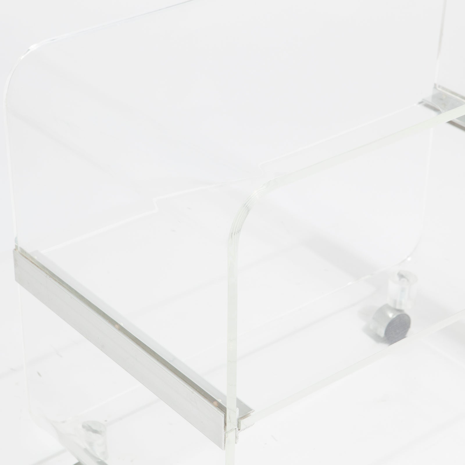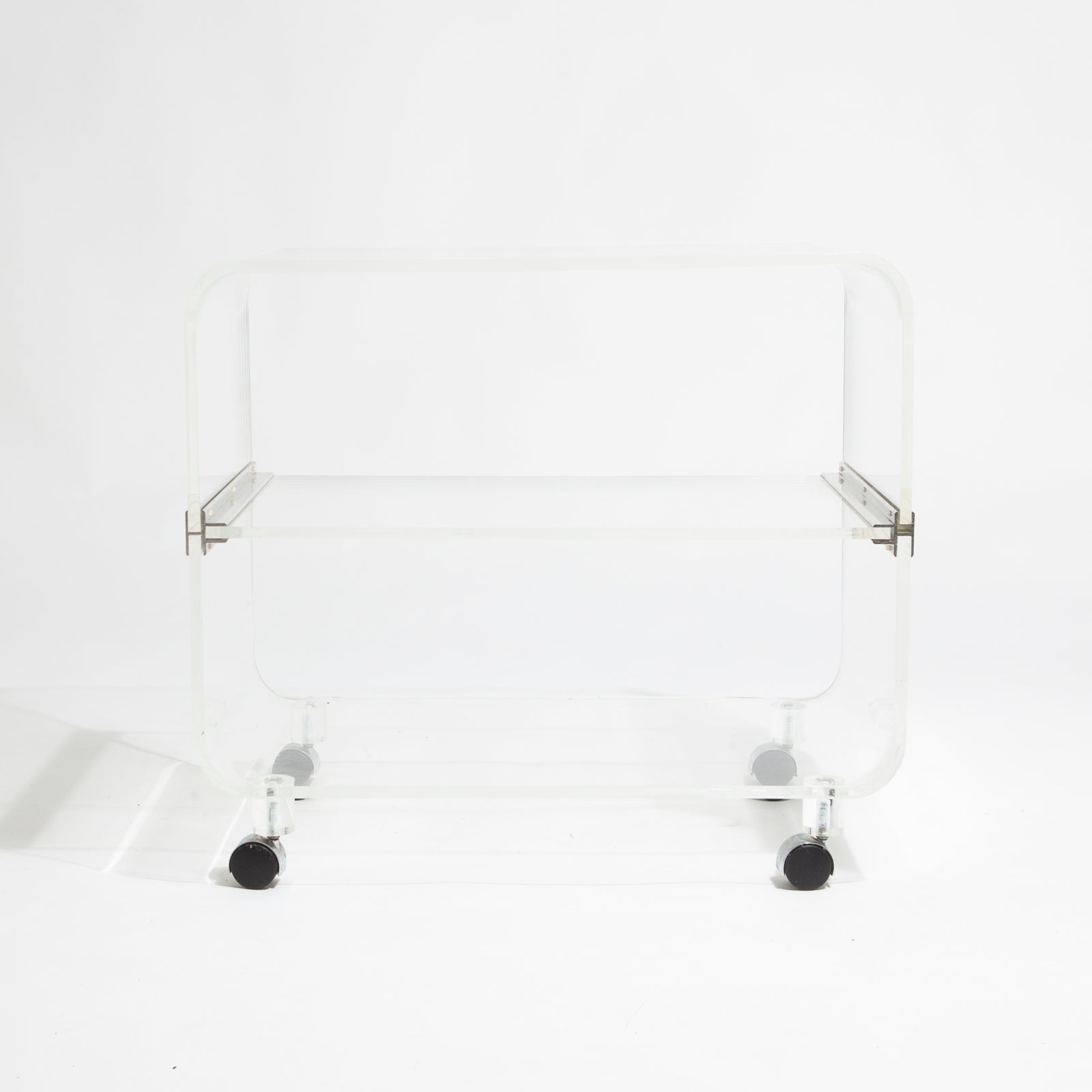 Fantastic post modern lucite rolling trolley. Would make a great bookcase, bar cart, side table, nightstand, or media unit.